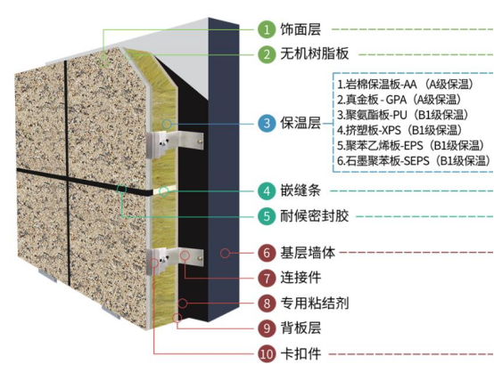 保溫裝飾一體板可以與各類A級、B級保溫芯材進行復合,如A級防火類保溫芯材(巖棉、真金板、熱固保溫板)等,B級防火類保溫芯材(聚氨酯、擠塑板、聚苯板、酚醛板等)。具有環保無污染、防火隔熱、隔音、施工便捷、降低成本等優點。