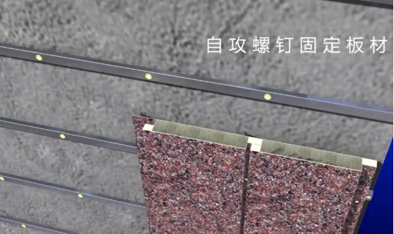 干掛型,這種安裝方式和石材干掛的方式有點類似,需要在墻體基層上預裝鋼制龍骨,外墻一體板通過特殊的專用錨固件與龍骨連接,一體板與墻體基層間通過填充發泡聚氨酯或其他材料。