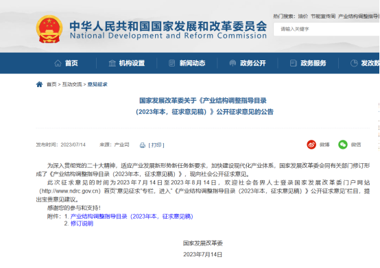 2023年七月十四日國家發改委在官網發布了關于《產業結構調整指導目錄(2023年本,征求意見稿)》(簡稱《目錄》)公開征求意見的公告。